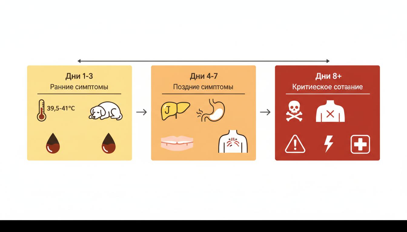 Срочный визит к врачу требуется при температуре выше 40°C, темной моче, сильной вялости, отказе от воды, судорогах или потере координации. Эти симптомы указывают на тяжелое течение пироплазмоза, требующее немедленного лечения.